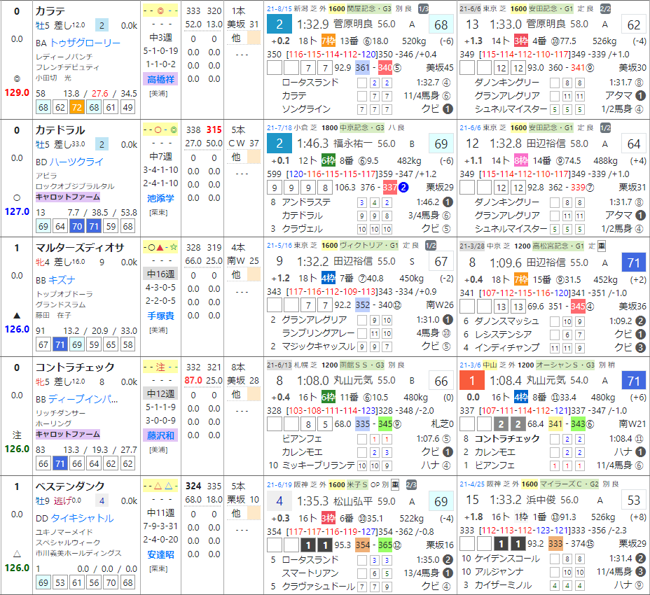 4枠位内で、前走はG1でボロ負け、着順は別としてタイム差では0.5秒前後とそれなりだった馬達。