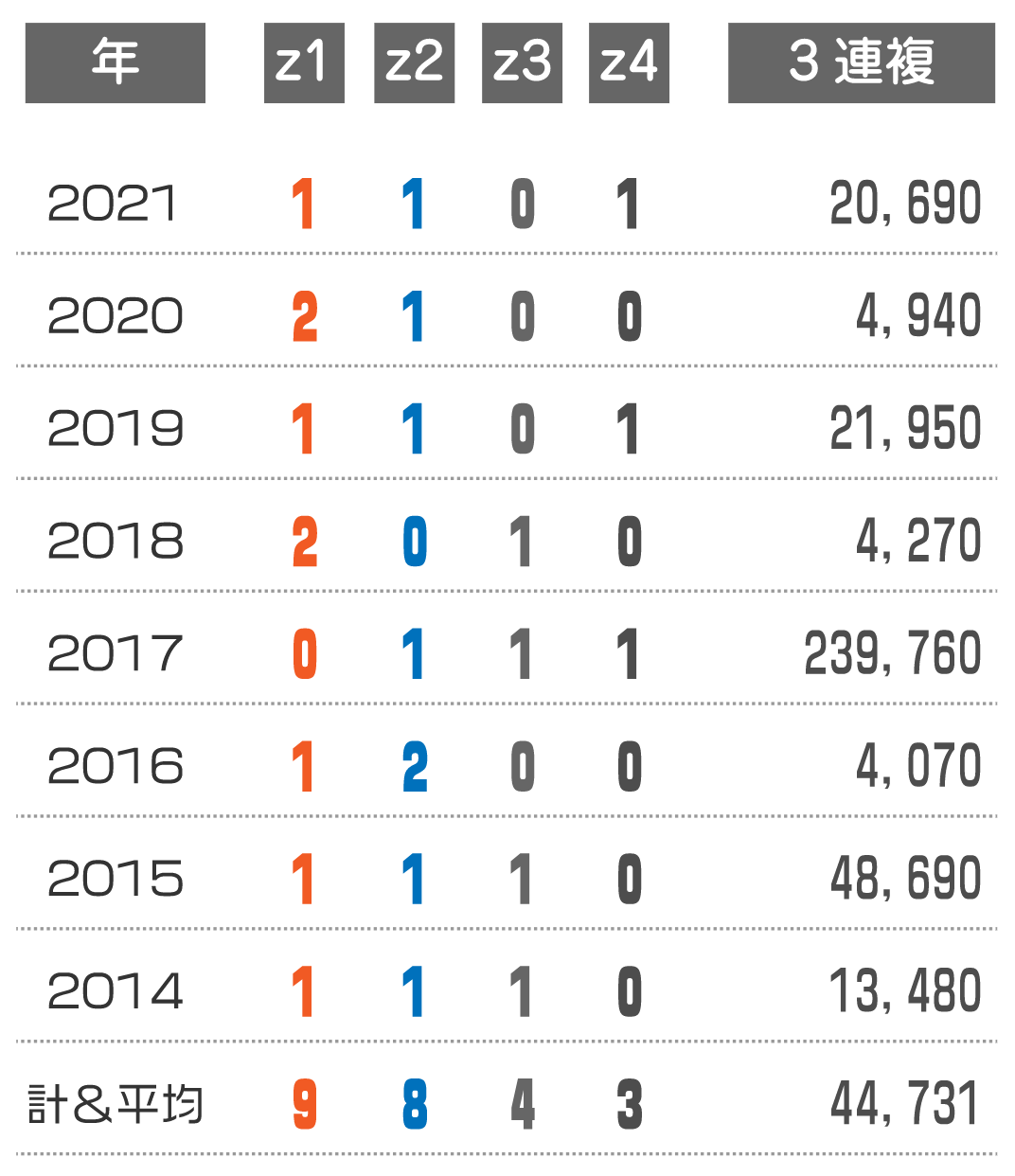 z1:1~3番人気の馬が3着以内に来た頭数z2:4~6番人気