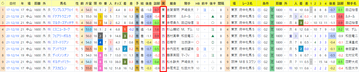 赤線が1ブロック目の馬。