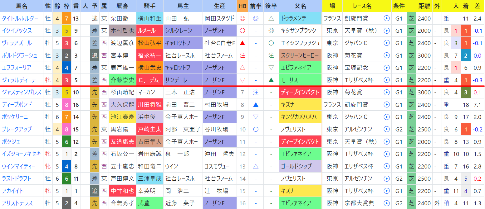 今年の出走馬をハイブリッド指数印順に並び替えると。