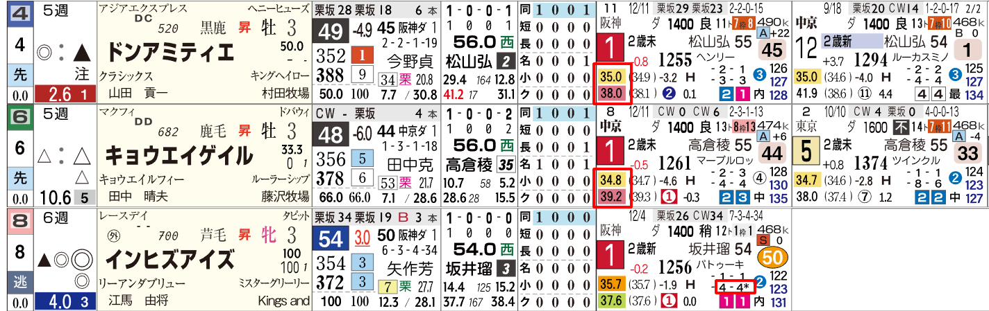 上に比べて印は落ちますが、同馬も前走は「詰脚」パターンで「黄色・赤」。