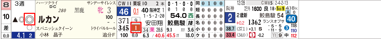 丹内祐次騎手の2つ目。5・コスモチプリアはHB〇、後半〇と印は揃っております。