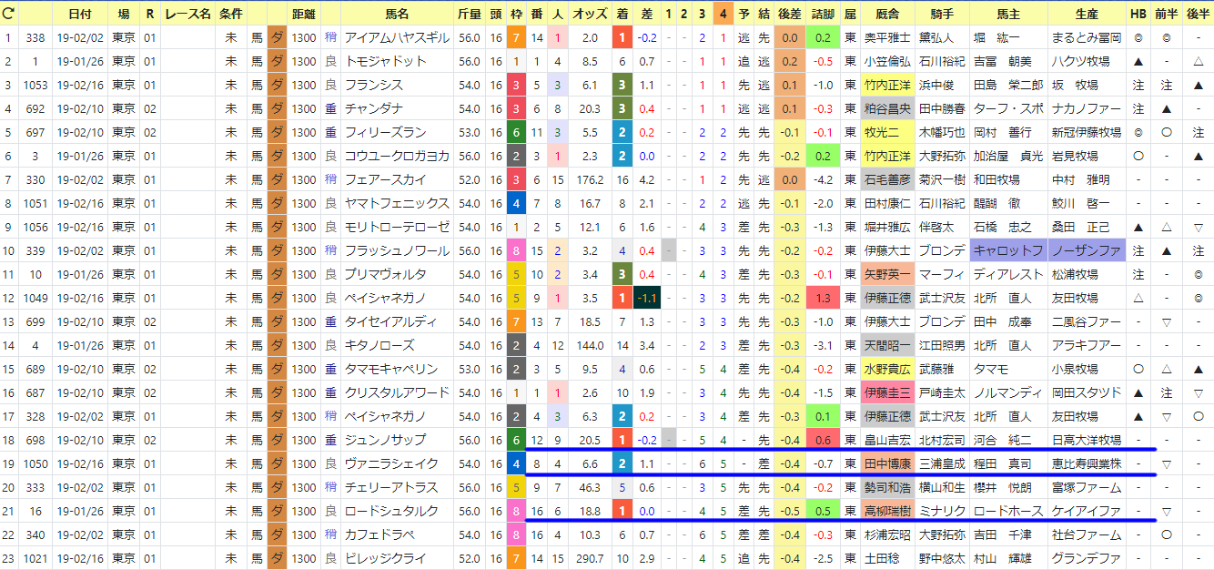上の画像は更にそこから「番」(馬番)を選択で馬番順に並び替え。