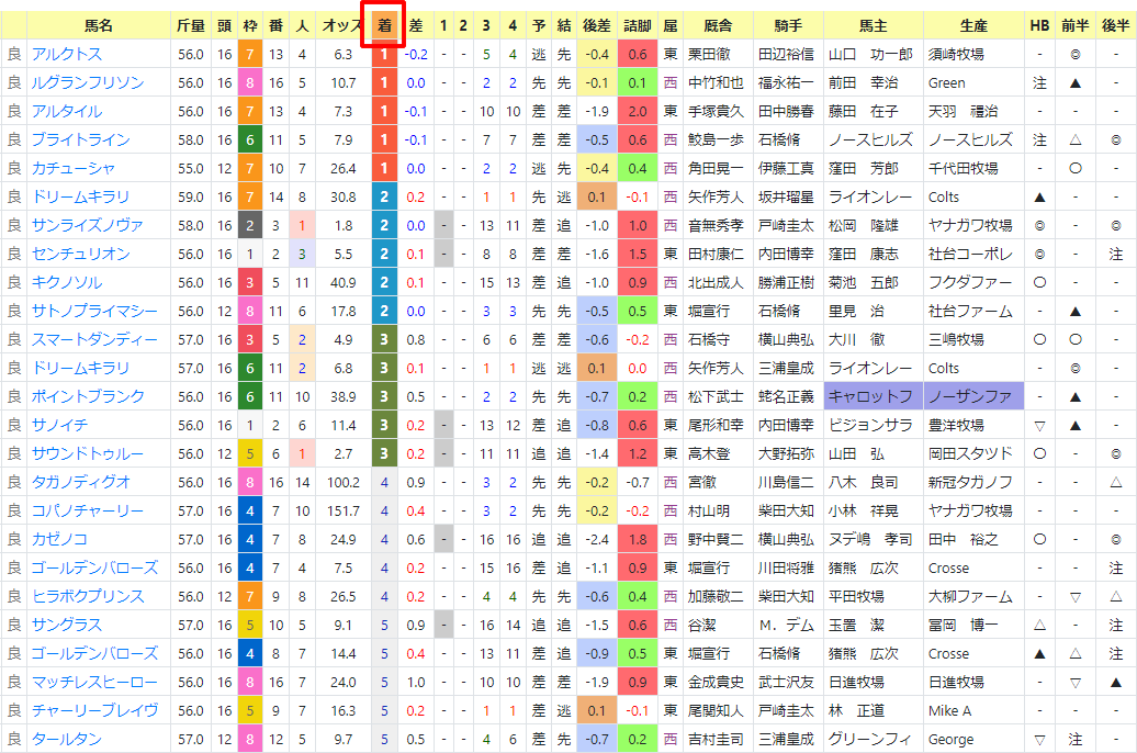 まずはヘッダ部分の「着」を選択で着順で並び替え。