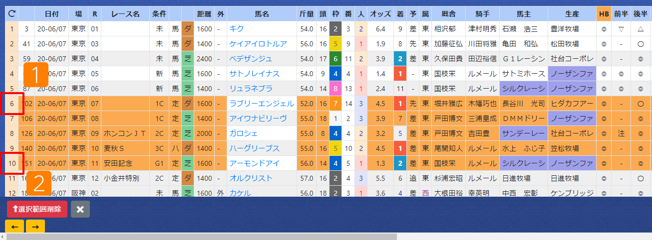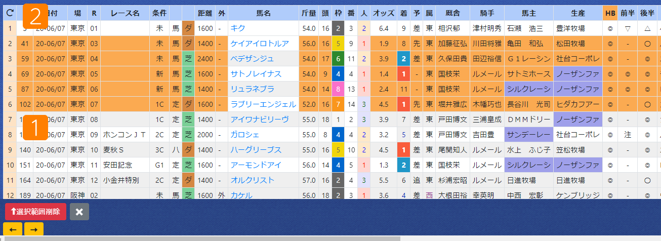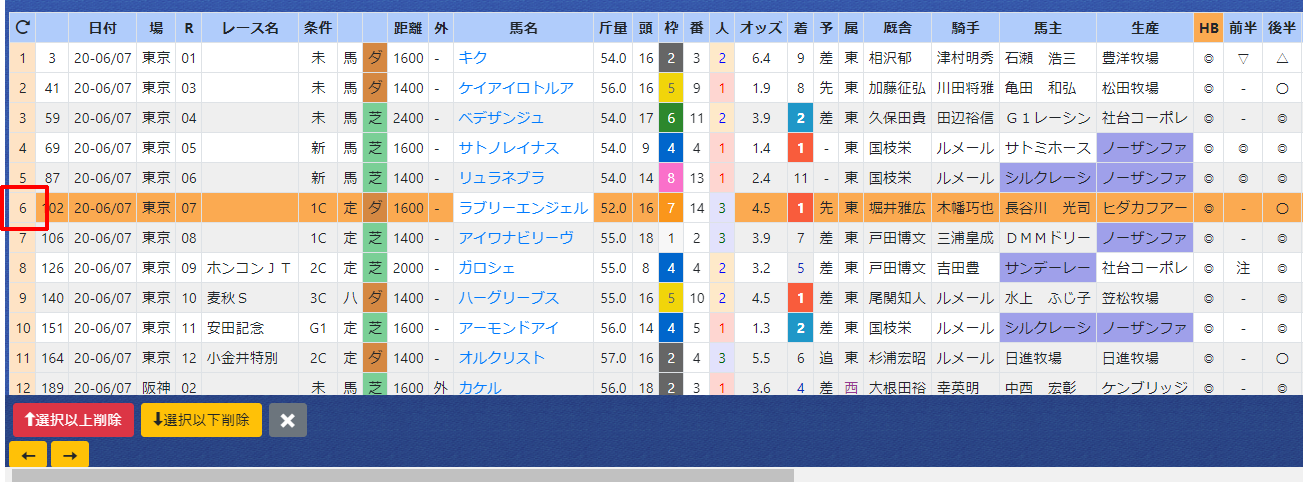 6:下部のボタン「選択範囲削除」でテーブルから前走新潟を消す。