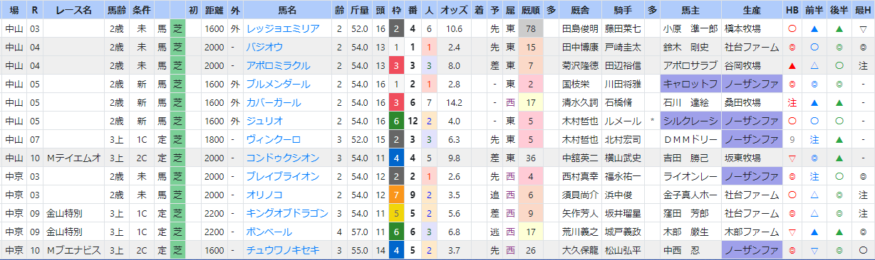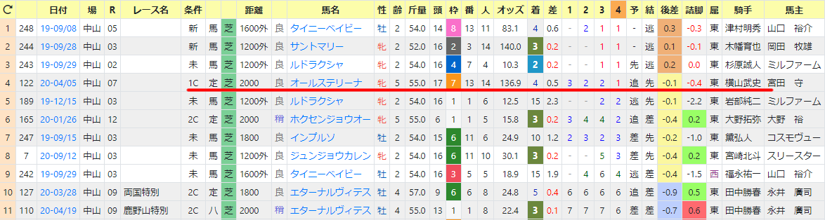 同厩舎の中山芝の過去1年分を、4角通過順で並べると分かりますね。