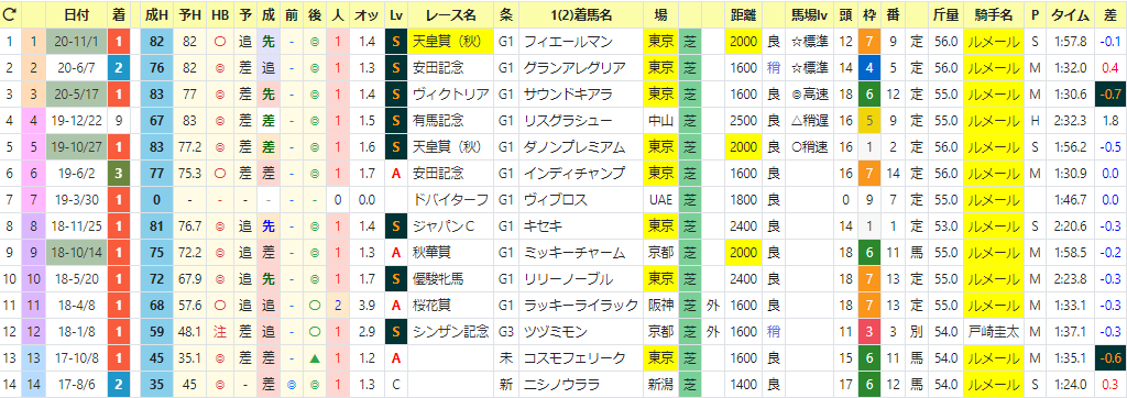 別画面にて、過去の天皇賞(秋)に出走した全馬が表示さられるので、「推定後半3ハロン」◎の成績等を調べられます。