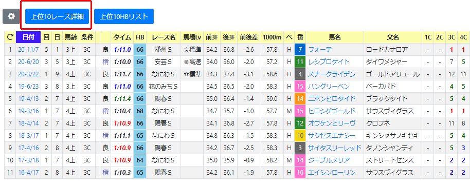 上にある「上位10レース詳細」ボタンで、いつも過去の重賞成績データで使ってるアノ画面へ。