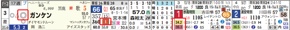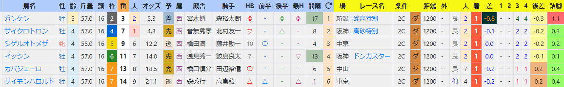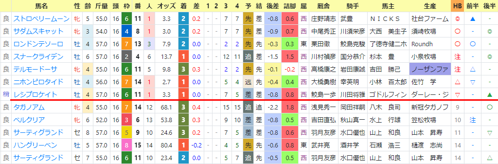 殆どが逃げ・先行馬で、HB◎の3・ガンケン以外は2番手以内の通過順です。