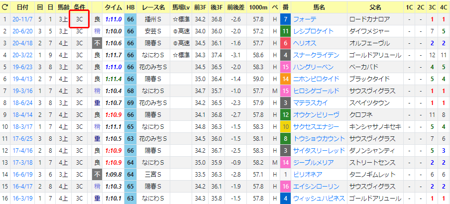 セル内の「3C」(3勝クラス)を選択すると、そのクラスの成績のみにフィルタリング。